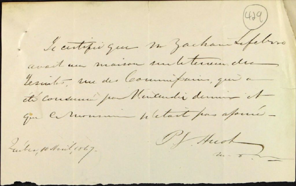 - Attestation de biens par P. G. Huot, que Zacharie Lefebvre, avait avant l'incendie, une maison sur le terrain des Jésuites, sur la rue des Commissaires