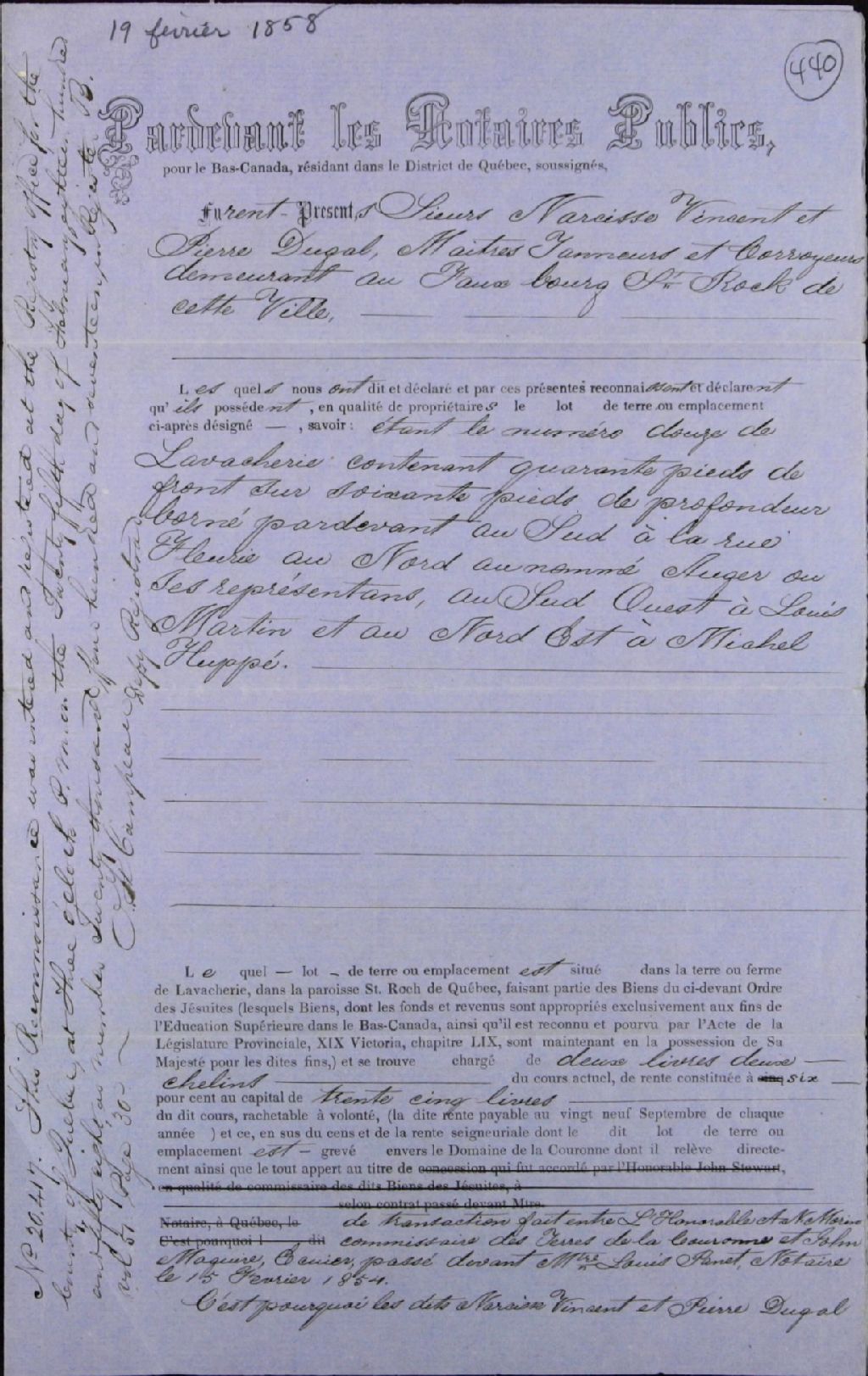 Reconnaissance d'un emplacement, par-devant les notaires publics du Bas-Canada, situé audit lieu de La Vacherie, par Narcisse Vincent et Pierre Dugal, maîtres tanneur et corroyeur, demeurant au faubourg Saint-Roch, 19 février 1858, Archives nationales à Québec, Fonds Ministère des Terres et Forêts, (03Q,E21,S64,SS5,SSS8,D440).