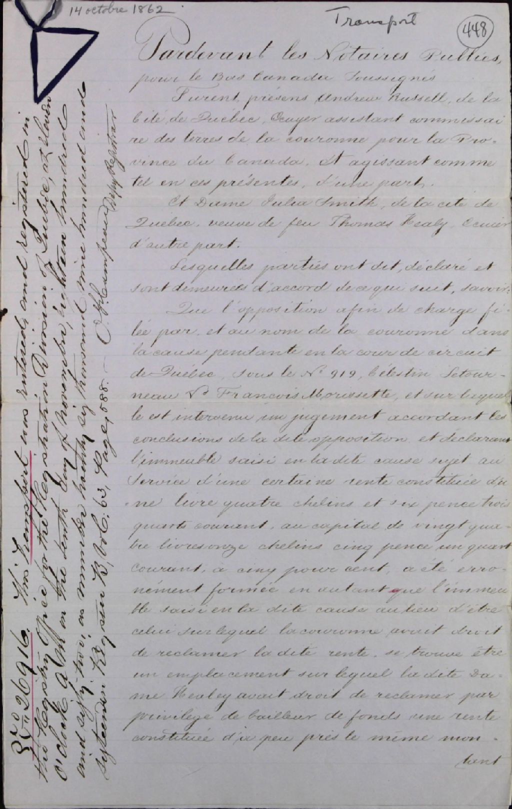 Transport par Andrew Russell, de la cité de Québec, assistant commissaire des Terres de la Couronne, et de Julia Smith, de la cité de Québec, veuve de feu Thomas Healy, écuyer, 11 octobre 1862, Archives nationales à Québec, Fonds Ministère des Terres et Forêts, (03Q,E21,S64,SS5,SSS8,D448).
