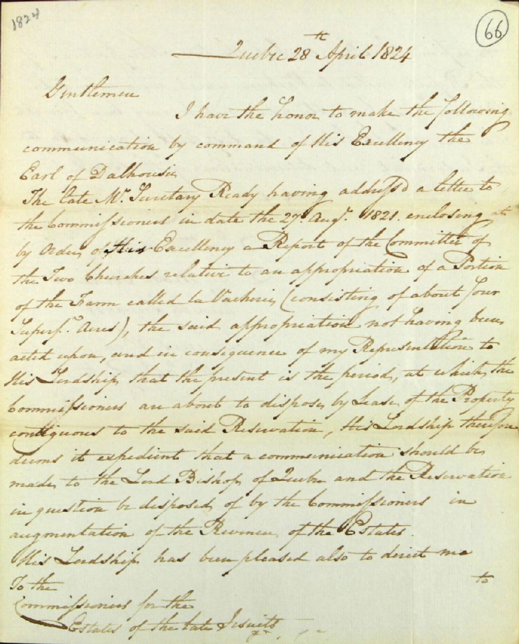 Lettre de Lewis Foy, inspecteur visiteur des biens des Jésuites, aux commissaires des biens des Jésuites, au sujet de l'appropriation d'une partie de la ferme nommée la Vacherie pour l'utilité publique (églises), 28 avril 1824, Archives nationales à Québec, Fonds Ministère des Terres et Forêts, (03Q,E21,S64,SS5,SSS8,D66).