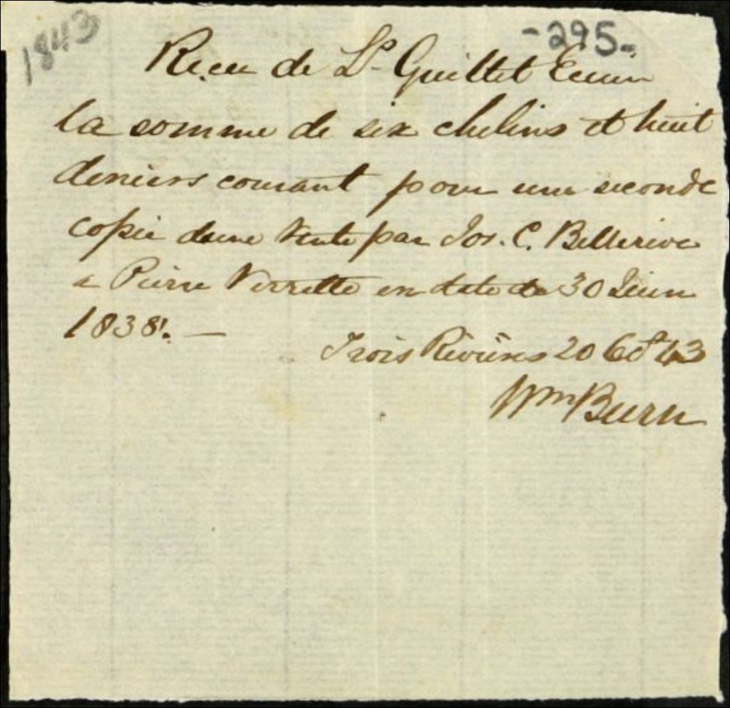 Reçu de William Burn, à Louis Guillet, agent des biens des Jésuites pour le district des Trois-Rivières, pour l'obtention d'une copie d'acte, 20 octobre 1843, Archives nationales à Québec, Fonds Ministère des Terres et Forêts, (03Q,E21,S64,SS5,SSS9,D295).