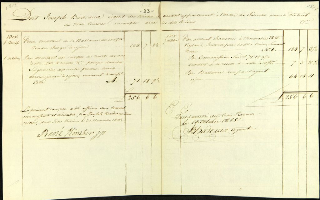 Compte courant de Joseph Badeaux, agent des biens des Jésuites dans le district des Trois-Rivières, pour la période du 1er avril au 1er octobre 1815., 10 octobre 1815, Archives nationales à Québec, Fonds Ministère des Terres et Forêts, (03Q,E21,S64,SS5,SSS9,D33).