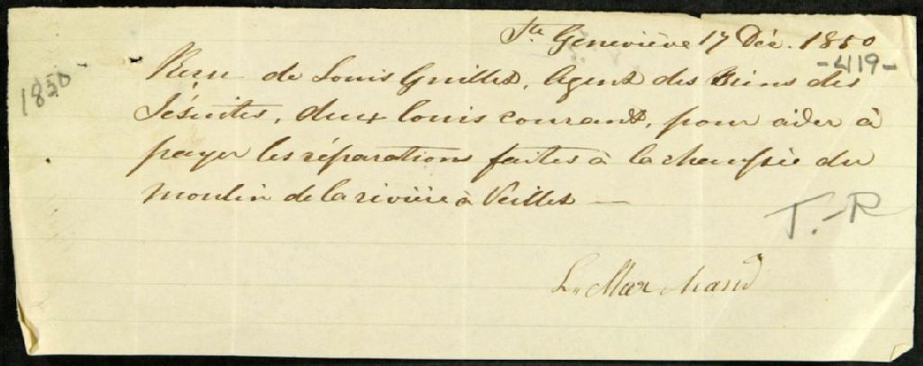 Compte général des argents reçus et déboursés par Louis Guillet, agent des biens des Jésuites pour le district des Trois-Rivières, depuis le 1er octobre jusqu'au 20 décembre 1850, 11 mars 1850 - 24 décembre 1850, Archives nationales à Québec, Fonds Ministère des Terres et Forêts, (03Q,E21,S64,SS5,SSS9,D419).