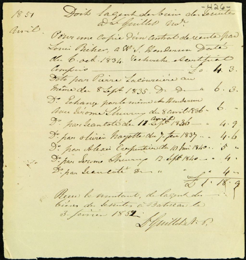 Reçu de Louis Guillet, notaire public, à l'agent des biens des Jésuites, pour des copies d'actes notariés, 3 février 1852, Archives nationales à Québec, Fonds Ministère des Terres et Forêts, (03Q,E21,S64,SS5,SSS9,D426).