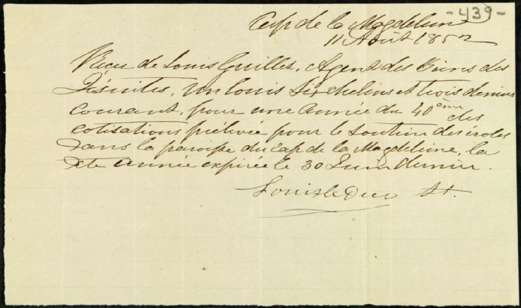 Reçu de Louis Leduc, à Louis Guillet, agent des biens des Jésuites pour le district des Trois-Rivières, pour cotisations au soutien des écoles de la paroisse du Cap-de-la-Madeleine, 11 août 1852, Archives nationales à Québec, Fonds Ministère des Terres et Forêts, (03Q,E21,S64,SS5,SSS9,D439).