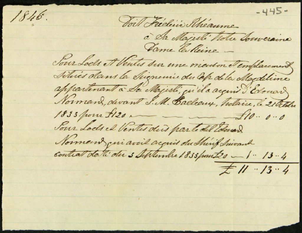 - Compte de Frédéric Rhéaume, à Sa Majesté la Reine, pour lods et ventes ; reçu de D.G. Labarre, syndic de la banqueroute dudit Rhéaume, à Louis Guillet, agent des biens des Jésuites pour le district des Trois-Rivières ; reçu de Louis Guillet, notaire public, audit Louis Guillet, junior, agent des biens des Jésuites ; et reçu de la Banque du Haut-Canada (Bank of Upper Canada), audit Louis Guillet