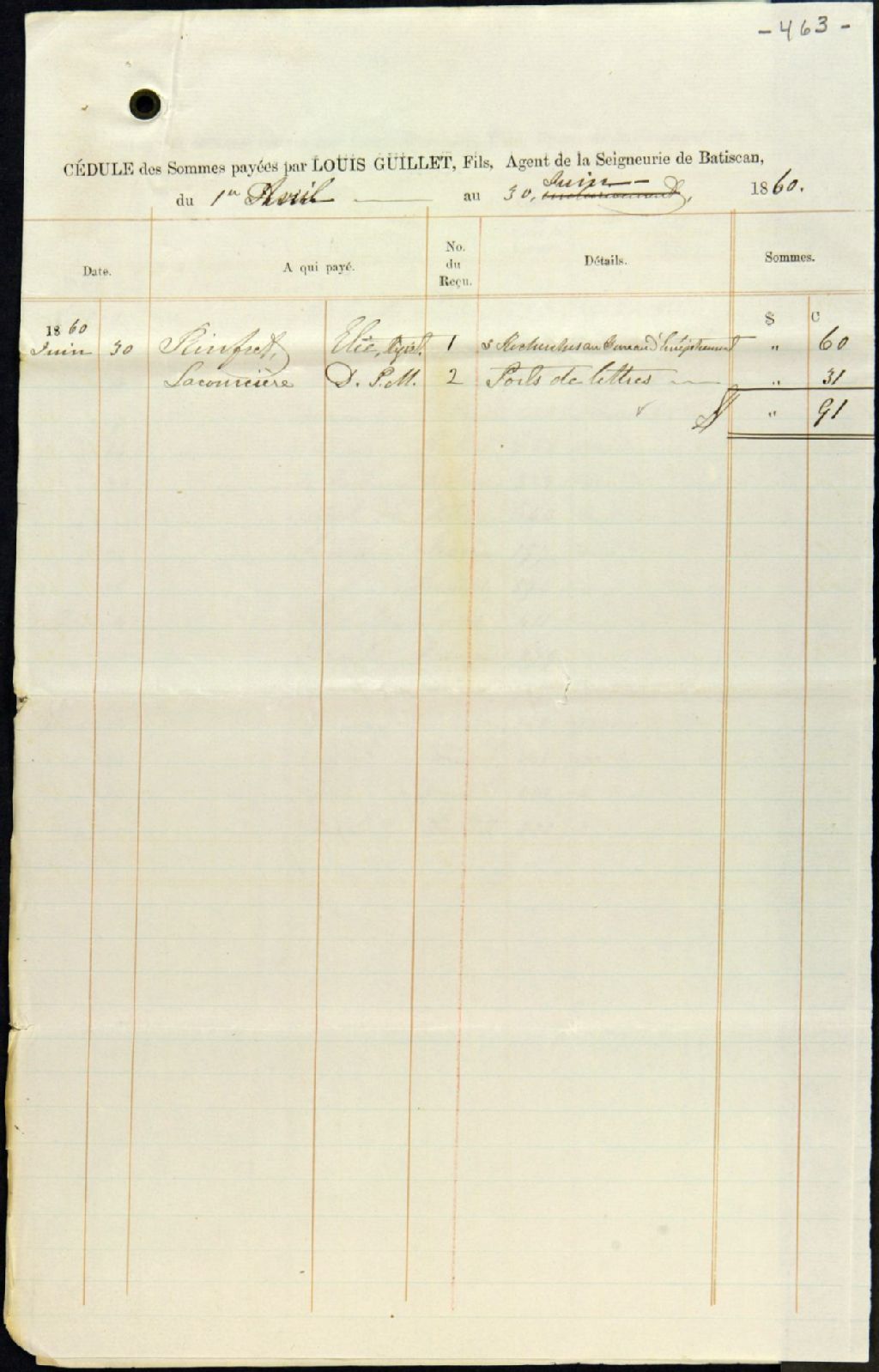 - Compte général des argents reçus et déboursés par Louis Guillet, fils, agent de la seigneurie de Batiscan, depuis le 1er avril jusqu'au 30 juin 1860