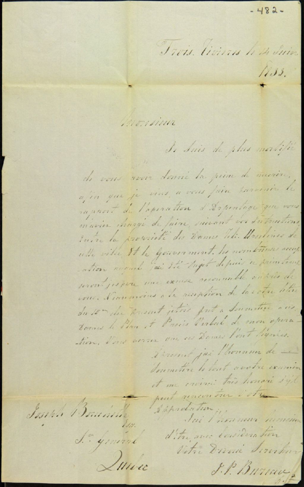 Lettre de Joseph P. Bureau, arpenteur juré des Trois-Rivières, à Joseph Bouchette, arpenteur général de Québec, transmettant le plan et le procès-verbal d'arpentage d'un terrain appartenant aux Ursulines des Trois-Rivières, 14 juin 1833, Archives nationales à Québec, Fonds Ministère des Terres et Forêts, (03Q,E21,S64,SS5,SSS9,D482).