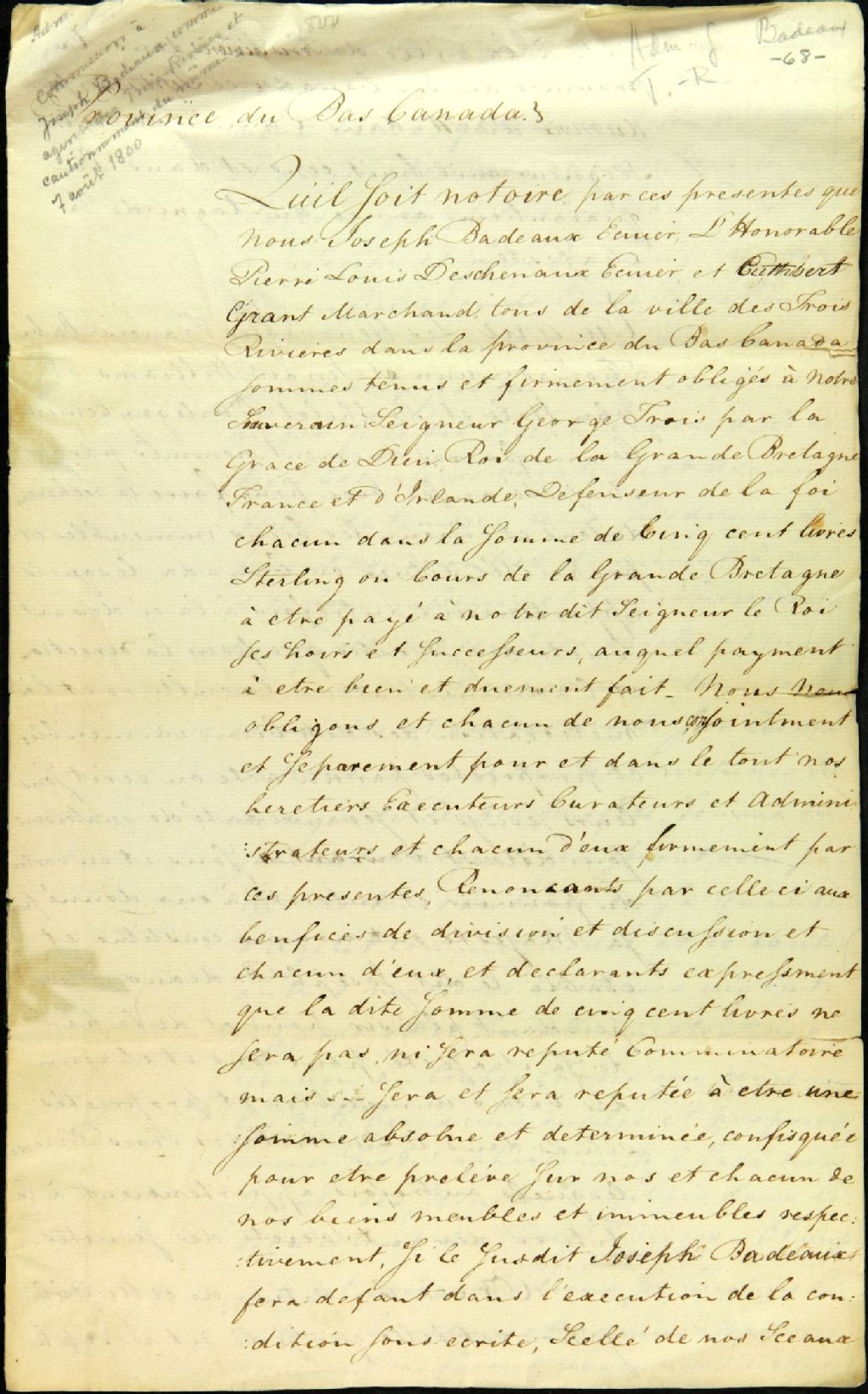 - Obligation de Joseph Badeaux, écuyer, Pierre-Louis Descheneaux, écuyer et Cuthbert Grant, marchand, tous de la ville des Trois-Rivières, au Roi George III