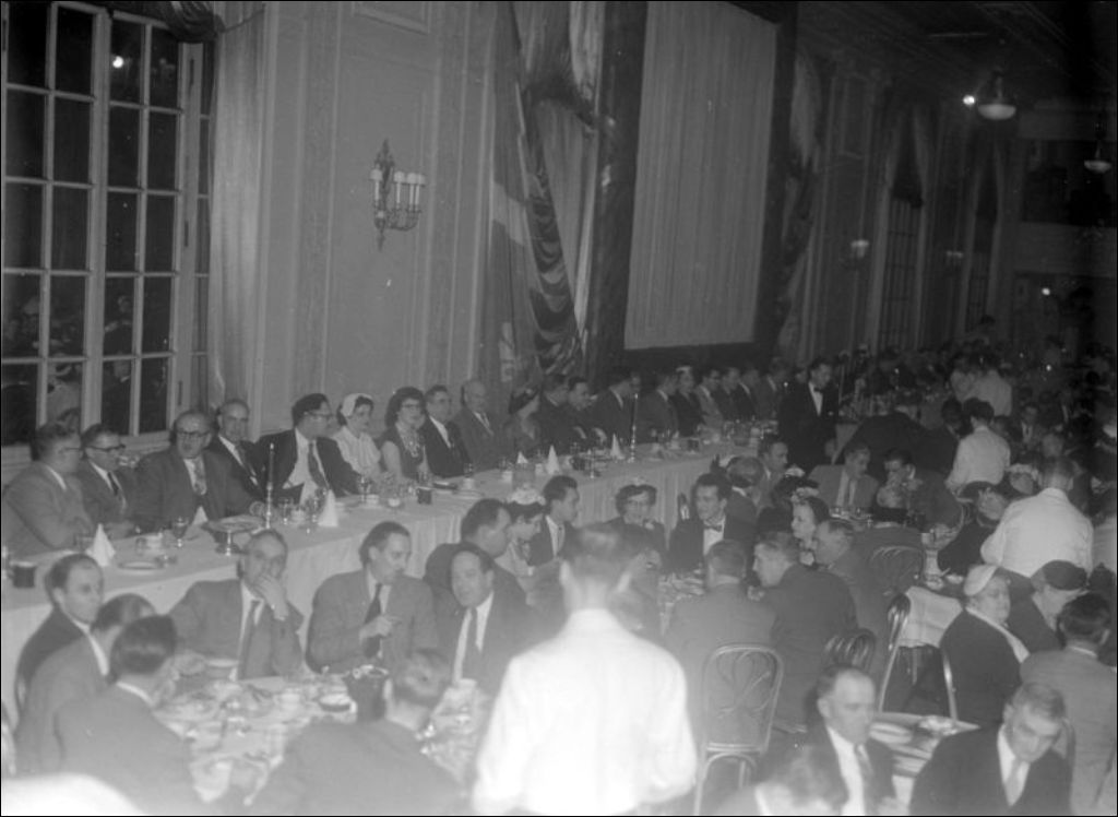 - Il s'agit d'un banquet. Nous apercevons les invités d'honneur (E6,S7,SS1,P201444, E6,S7,SS1,P201445 et E6,S7,SS1,P201447) dont possiblement Antonio Barrette, ministre du Travail (E6,S7,SS1,P201450), qui prononce une allocution (E6,S7,SS1,P201446). Nous remarquons les convives réunis (E6,S7,SS1,P201443, E6,S7,SS1,P201448 et E6,S7,SS1,P201449)