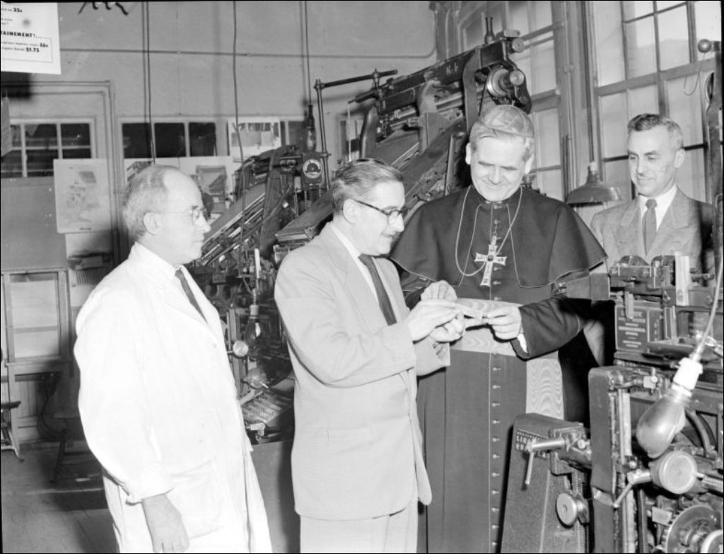 - Paul-Émile Léger, cardinal, visite les étudiants et les installations de l'École des Arts Graphiques située sur la rue Kimberley à Montréal. Nous apercevons le cardinal qui prononce un discours (E6,S7,SS1,P205262)