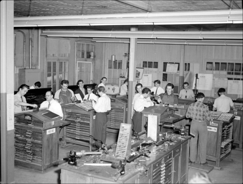 - Visite des membres de la Commission d'apprentissage à l'École des Arts Graphiques située sur la rue Kimberley à Montréal. Nous apercevons les invités qui visitent les installations et les étudiants de l'École. Dossier produit pour R. Prévost, ministère du Bien-être social et de la Jeunesse
