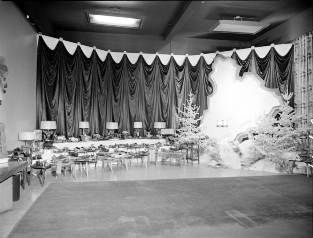 - Remise de prix par J.-Paul Sauvé, ministre du Bien-être social et de la Jeunesse. Nous remarquons également le décor où sont placés les cadeaux (E6,S7,SS1,P207504) et les marmitons (E6,S7,SS1,P207510). Dossier produit pour M. Lévesque