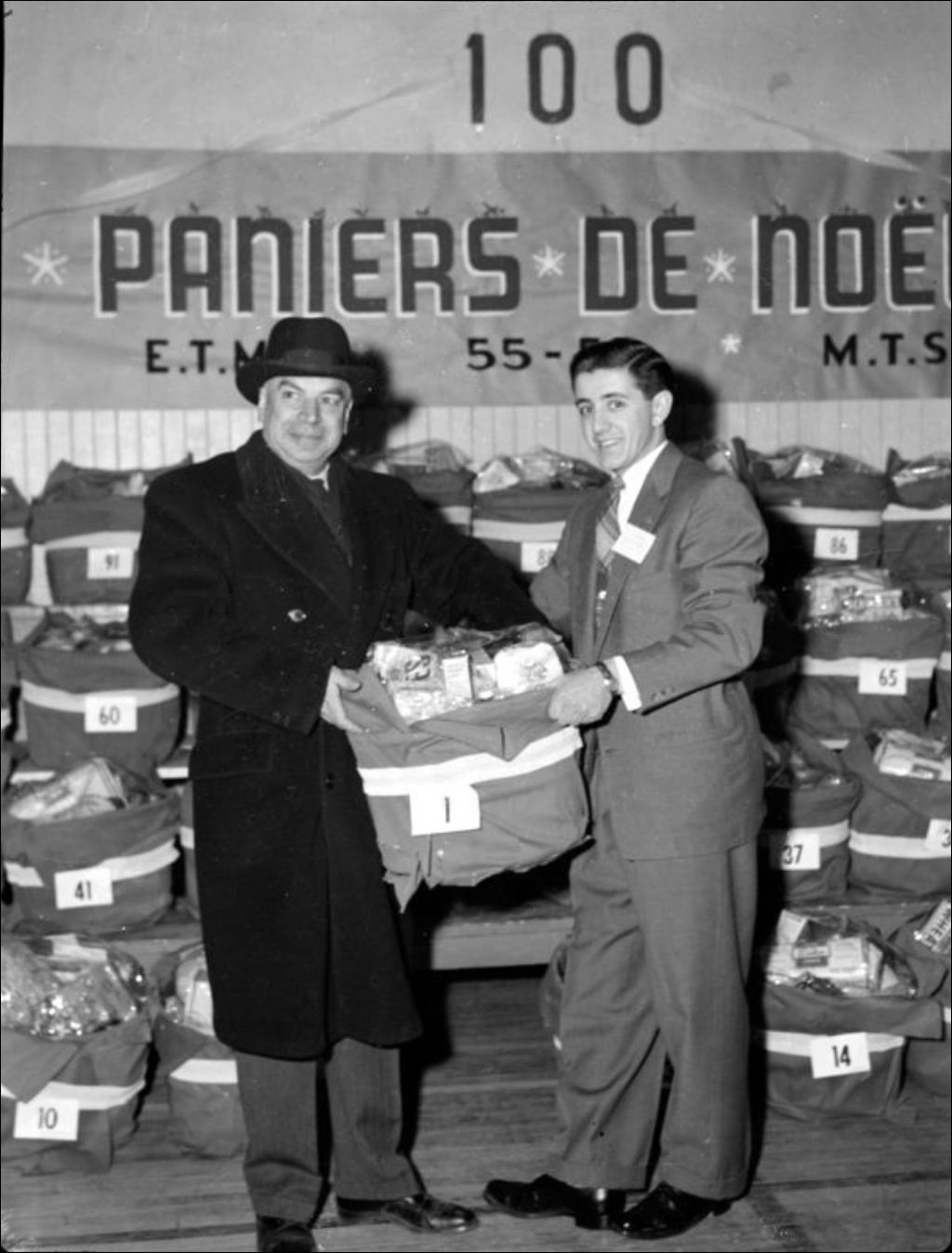 - Distribution de paniers de provisions à l'occasion de Noël par les élèves de l'École Technique située sur la rue Sherbrooke Ouest à Montréal. Nous remarquons également les organisateurs réunis (E6,S7,SS1,P207556). Dossier produit pour M. Belisle