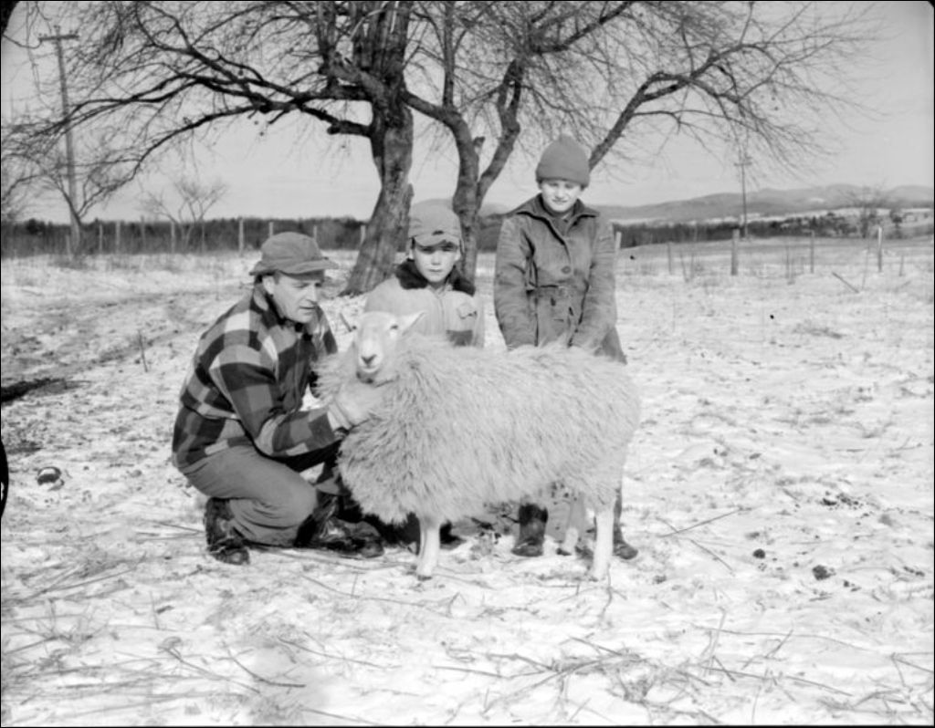 Mouton sur une ferme à Stanbridge, en Montérégie, [195-?], Archives nationales à Montréal, Fonds Ministère de la Culture et des Communications, (06M,E6,S7,SS1,D213155-213155), Photographe non identifié.