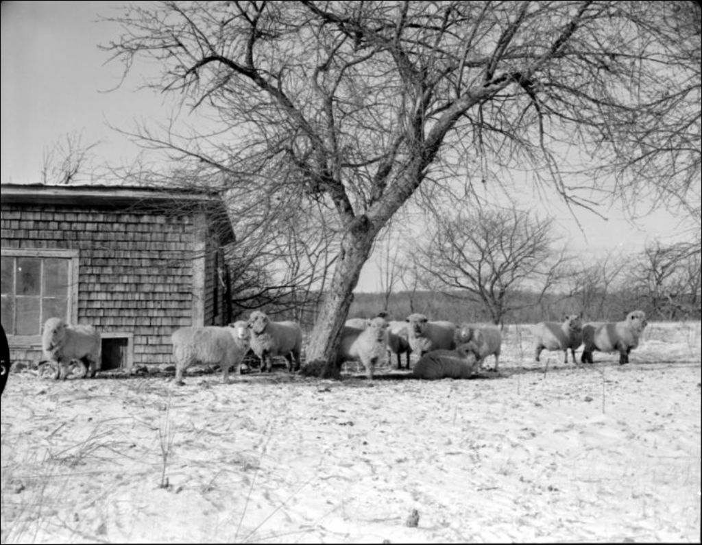 Moutons sur une ferme à Stanbridge, en Montérégie, [195-?], Archives nationales à Montréal, Fonds Ministère de la Culture et des Communications, (06M,E6,S7,SS1,D213157-213157), Photographe non identifié.
