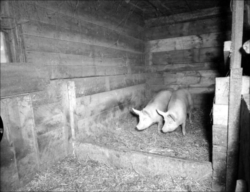 Cochons dans un enclos à Stanbridge, en Montérégie, [195-?], Archives nationales à Montréal, Fonds Ministère de la Culture et des Communications, (06M,E6,S7,SS1,D213160-213160), Photographe non identifié.