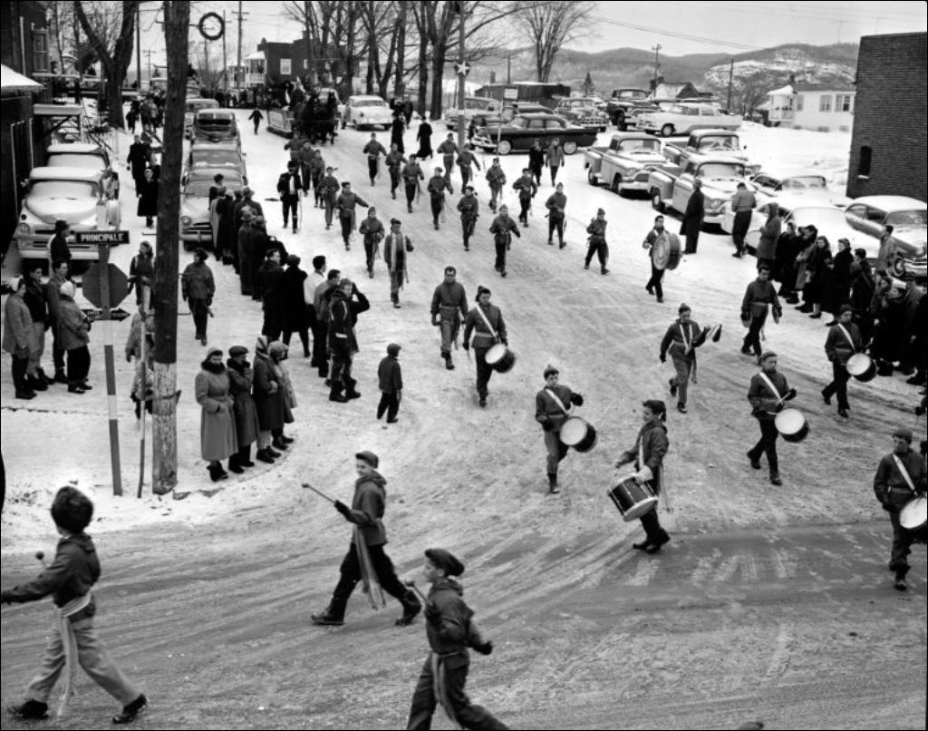 La fanfare Sainte-Agathe, composée de joueurs de trombone et de tambours, circule dans les rues de la ville. Dossier commandé par messieurs R. Patenaude et Ratelle