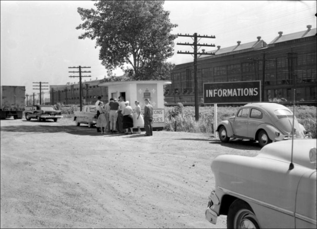 - Représentation du Service du Tourisme, situé à proximité du Square Dorchester. Nous apercevons également une cabane faisant office de bureau d'informations touristiques. À ces images s'ajoutent celles d'automobiles dont les plaques d'immatriculation indiquent leurs diverses provenances: Ohio, Iowa, Illinois et Arkansas. Enfin, des clichés d'une enseigne, située sur le bord de la route 2-17, indiquent la présence d'un service d'informations touristiques à 500 pieds. Dossier réalisé pour monsieur R. Patenaude