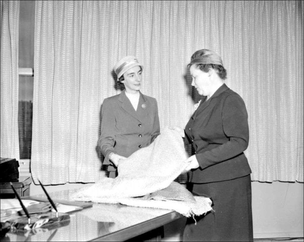 - L'employée du Canadian Fabrics Foundation présente des tissus à la représentante de l'École ménagère. Photographies réalisées pour madame Gloutnez
