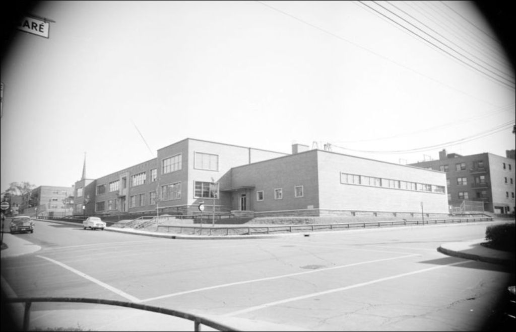 - Représentation de diverses écoles montréalaises (P215698, P215693, P215695), dont la St. Kevins School, située près de la rue Légaré (P215690). Nous apercevons également un autobus de la Commission scolaire Marie-Victorin (P215693 et P215695). À ces clichés s'ajoutent ceux d'un gymnase (P215701), d'une bibliothèque (P215696), d'une toilette (P215691) et d'une salle de classe (P215692, P215697, P215699, P215700). Dossier commandé par M. D. Allard