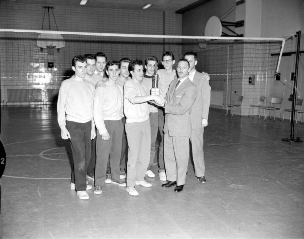 Ministère du Bien-être social et de la Jeunesse. Remise d'un prix à l'équipe de volley-ball gagnante du tournoi, [195-?], Archives nationales à Montréal, Fonds Ministère de la Culture et des Communications, (06M,E6,S7,SS1,D222075-222075), Paul Girard.