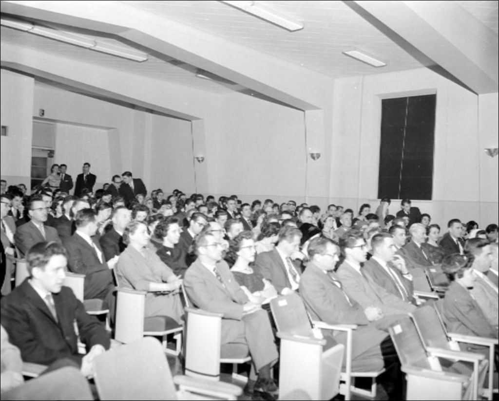 Une conférence est donnée dans un amphithéâtre à l'occasion des journées Portes ouvertes de l'École. Reportage commandé par Dr. Lafortune
