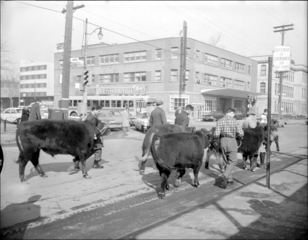 - Ce dossier présente, entre autres, des bovins et leur propriétaire paradant sur la rue Berri à l'angle De Montigny, probablement devenu Maisonneuve (E6,S7,SS2,P229217), sur la rue saint-Denis à la hauteur du Quartier latin (E6,S7,SS2,P229219), sur la rue Sainte-Catherine Est (E6,S7,SS2,P229220 à E6,S7,SS2,P229221) et sur la rue De Montigny Est (E6,S7,SS2,P229222)
