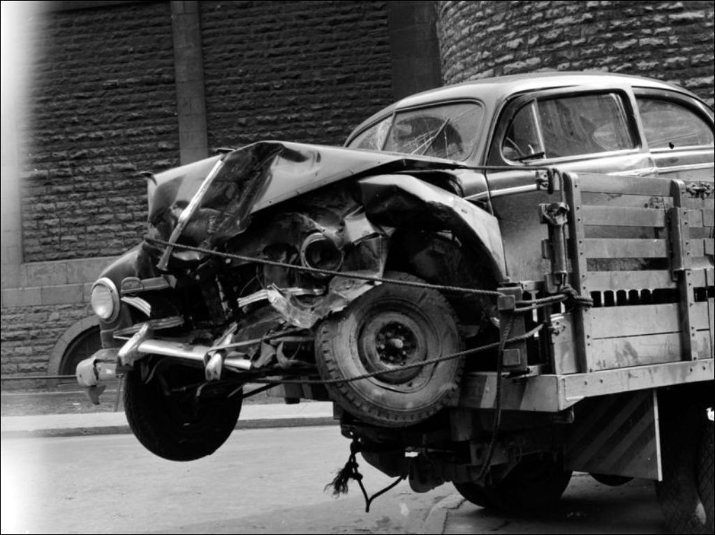 - Voiture accidentée du couple Poisson transportée par un camion-remorque. Le dossier a été réalisé pour l'École centrale d'arts et métiers et le ministère de la Jeunesse