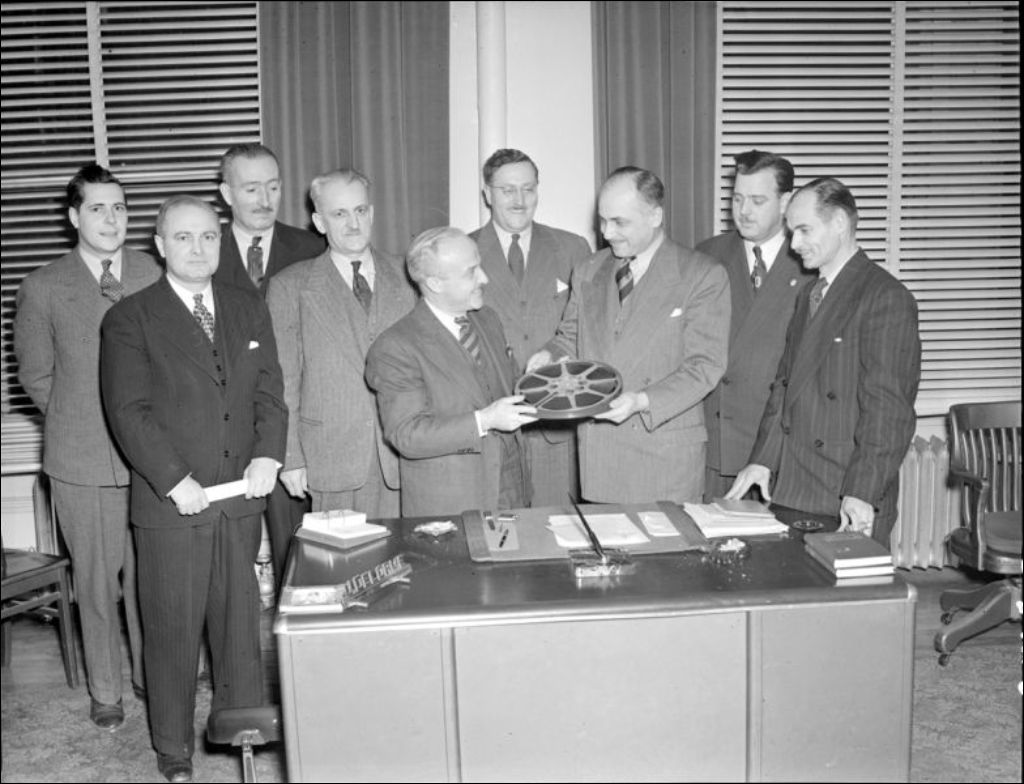 Personnel de l'École centrale d'arts et métiers réunis dans le bureau de Monsieur Delorme pour la présentation d'un film réalisé par Liquid Air. Images prises pour l'Office provincial de publicité et le ministère de la Jeunesse