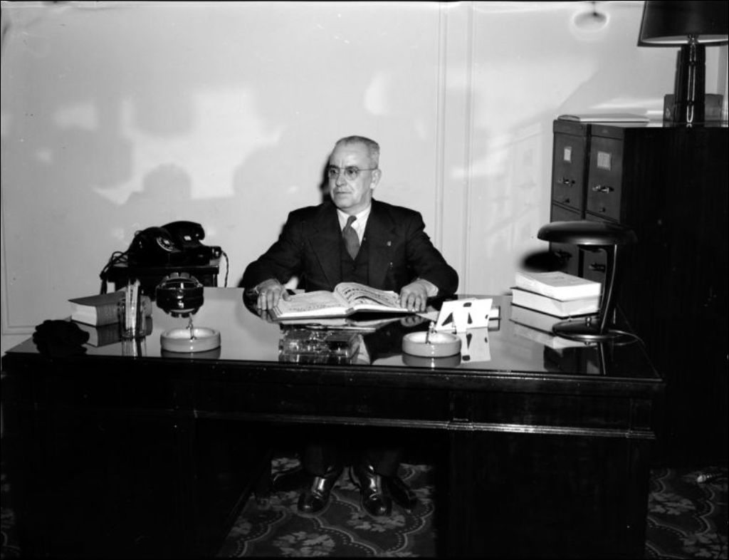 - Inspecteurs du Service de l'hôtellerie de la province réunis au Mount Royal Hotel de la rue Peel à l'occasion d'un congrès. Au milieu du groupe, se trouvent le chef Puvillan ainsi que de Gérard Delage, secrétaire général de l'Association des hôteliers de la province (E6,S7,SS1,P046856 et E6,S7,SS1,P046858). Nous remarquons aussi monsieur Pelletier, président des inspecteurs du Service de l'hôtellerie de la province (E6,S7,SS1,P046854 et E6,S7,SS1,P046859). Reportage préparé pour le Service de l'hôtellerie de la province et le ministère du Commerce et de l'Industrie