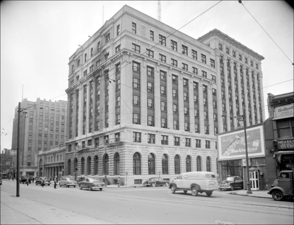 Il s'agit du bâtiment d'Hydro-Québec situé sur la rue Craig (devenue Saint-Antoine) à Montréal. La scène a été photographiée pour l'École des arts graphiques et le ministère du Bien-être social et de la Jeunesse