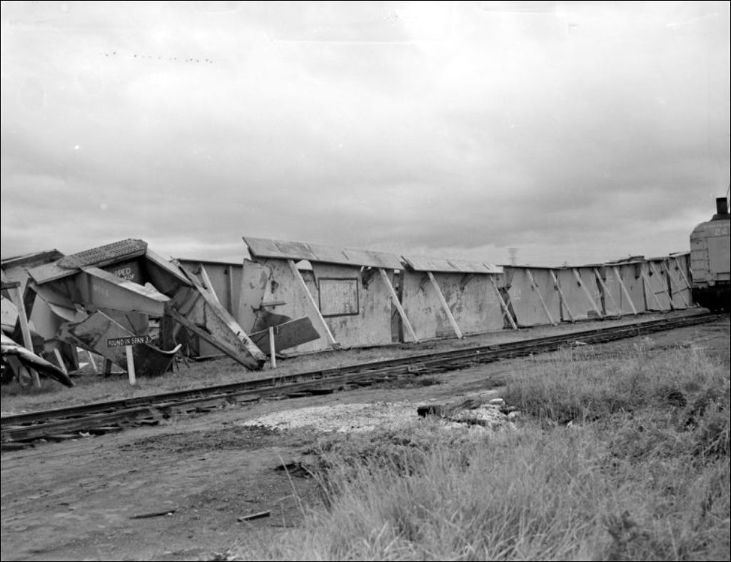 - Il s'agit des débris de l'effondrement du pont Duplessis reliant Trois-Rivières et Cap-de-la-Madeleine, assemblés au terrain de la Commune à Trois-Rivières, de manière à reconstituer la portion écroulée du pont. Nous remarquons des parties de travées; des rails et des wagons du Canadian Pacific Railway. Les scènes ont été photographiées pour le Service des ponts du ministère des Travaux publics
