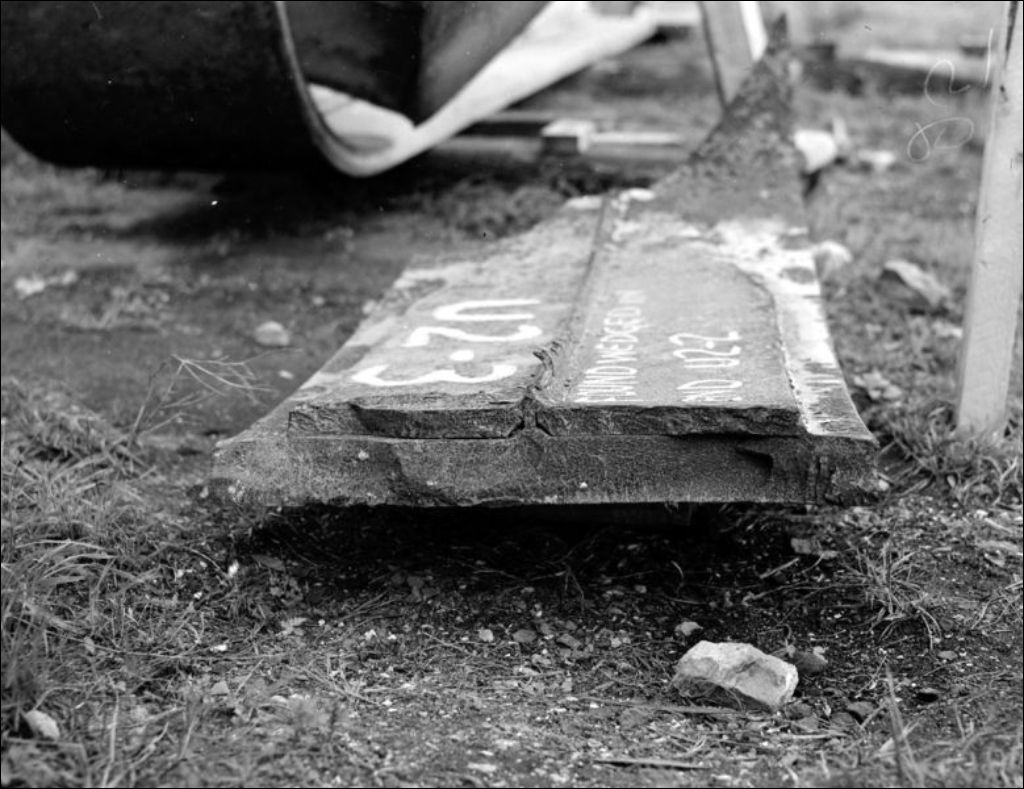 - Il s'agit des débris de l'effondrement du pont Duplessis reliant Trois-Rivières et Cap-de-la-Madeleine, assemblés au terrain de la Commune à Trois-Rivières, de manière à reconstituer la portion écroulée du pont. Nous remarquons des parties de travées. Les scènes ont été photographiées pour le Service des ponts du ministère des Travaux publics