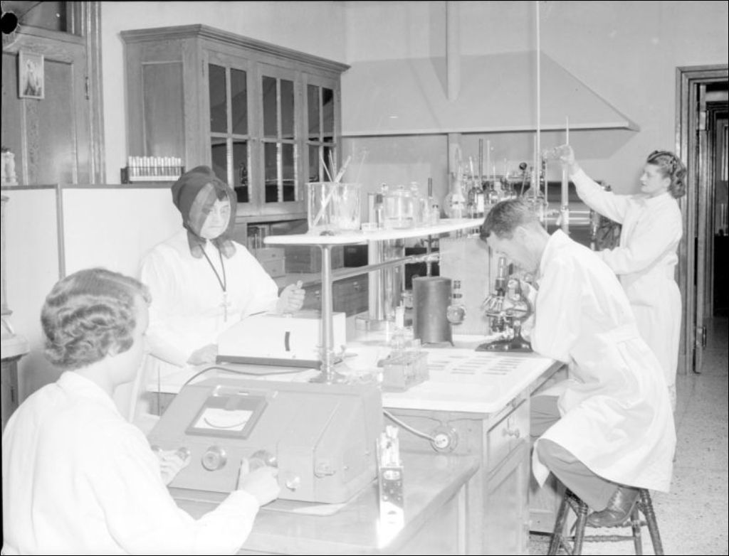 Vues d'un laboratoire. Nous apercevons probablement une religieuse de la congrégation des Soeurs grises