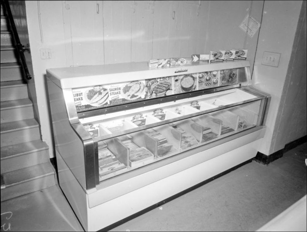 Cliché d'une vitrine contenant des poissons du magasin Pêcheurs unis de Québec situé sur la rue Saint-Laurent à Montréal. Dossier créé pour le Service de publicité, ministère de la Chasse et de la Pêche