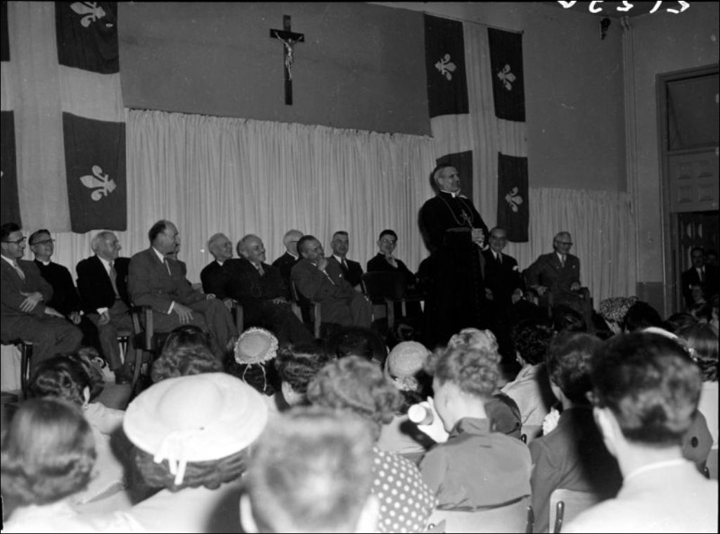 - Il s'agit d'une assemblée. Nous remarquons Paul-Émile Léger, archevêque de Montréal et Paul Sauvé, ministre du Bien-Être social et de la Jeunesse. Dossier produit pour le ministère du Bien-Être social et de la Jeunesse