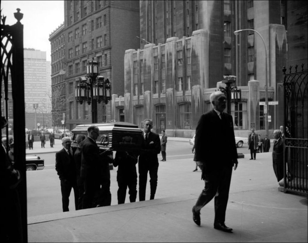 - M. A. Guérin, de l'Office du film, a demandé ces images de la translation des restes du chanoine Lionel Groulx. Les clichés montrent le transport du cercueil sur le parvis de l'église Notre-Dame à Montréal