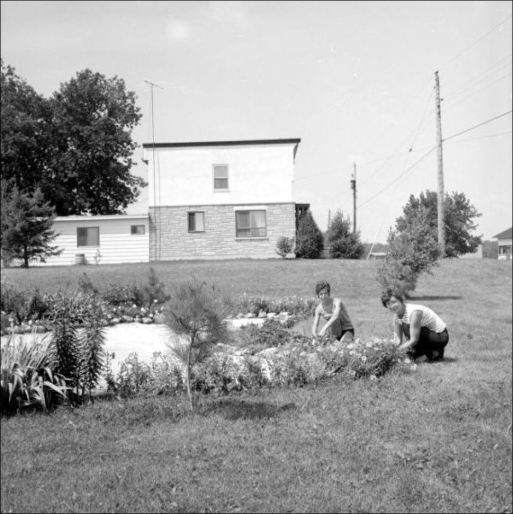 - On remarque le jardin de fleurs, les champs et l'arrosage automatique, l'équipement agricole et la maison devant laquelle la famille est réunie