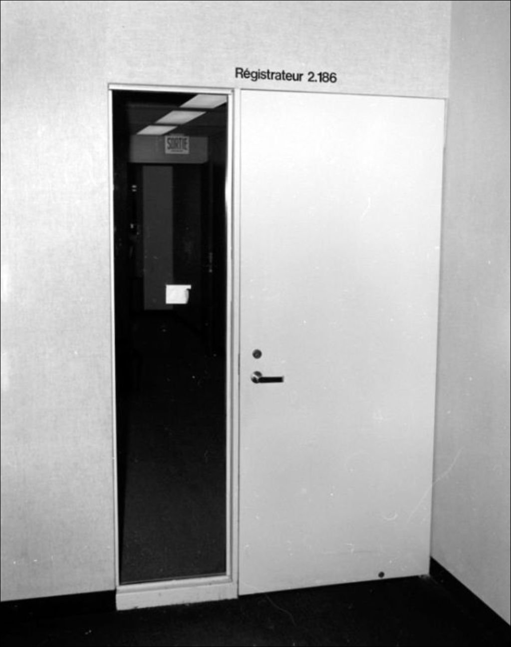 Porte vitrée de la chambre 2.186. Palais de justice, 1973, Archives nationales à Montréal, Fonds Ministère de la Culture et des Communications, (06M,E6,S7,SS1,D731393-731393), Gilles Langevin.