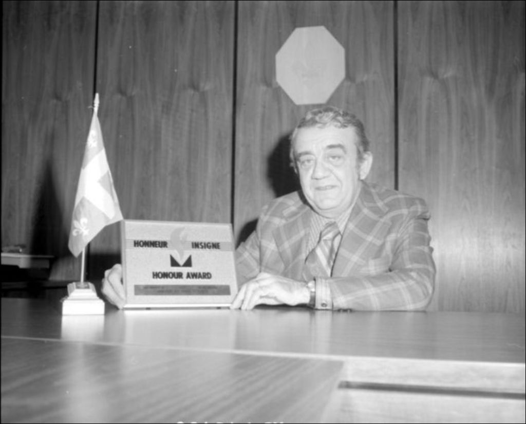 Remise d'un trophée à M. Donato. Square Phillips. Montréal, 1974, Archives nationales à Montréal, Fonds Ministère de la Culture et des Communications, (06M,E6,S7,SS1,D740100-740100), Adrien Hubert.