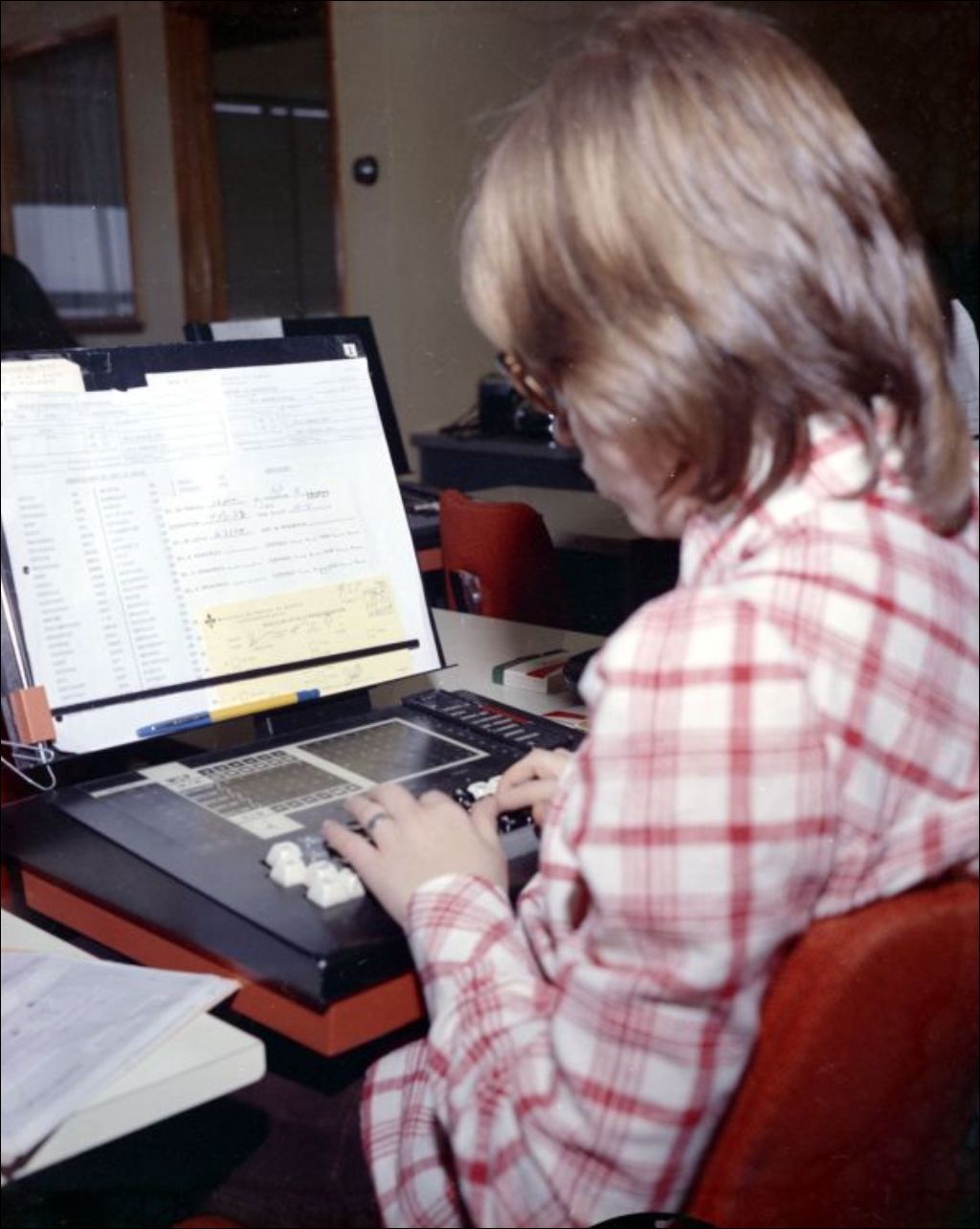 - Ces images nous montrent, dans un premier temps, le bureau de saisie des données informatiques du ministère (rue Dorchester à Québec) et deuxièmement, le centre de traitement et de conservation de ces mêmes données (avenue Chauveau à Québec). Nous voyons les équipements de saisie, de traitement et de conservation des données fiscales compilées par le ministère du Revenu. Enfin, nous apercevons un kiosque d'informations. Photographies demandées par Paul-E. Plouffe du ministère du Revenu, Service du centre d'informatique fiscale