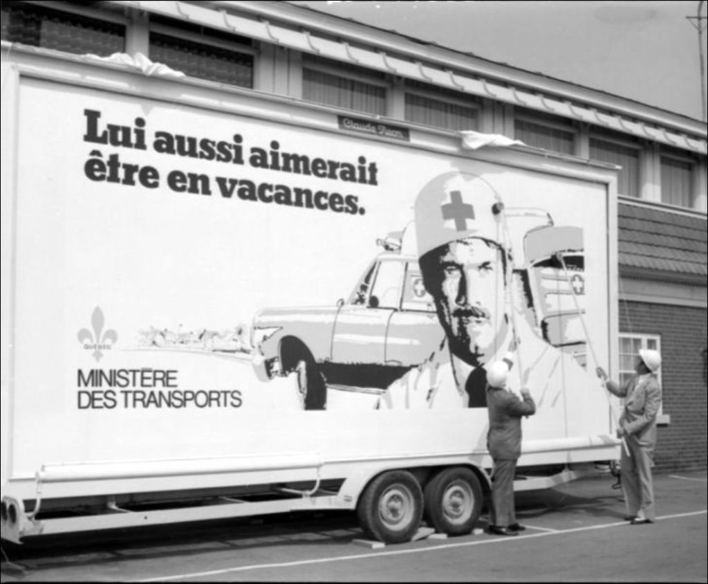 - Prises de vue de l'affiche publicitaire et photo de groupe. Images commandées par André Boulanger du ministère des Transports, Service des communications