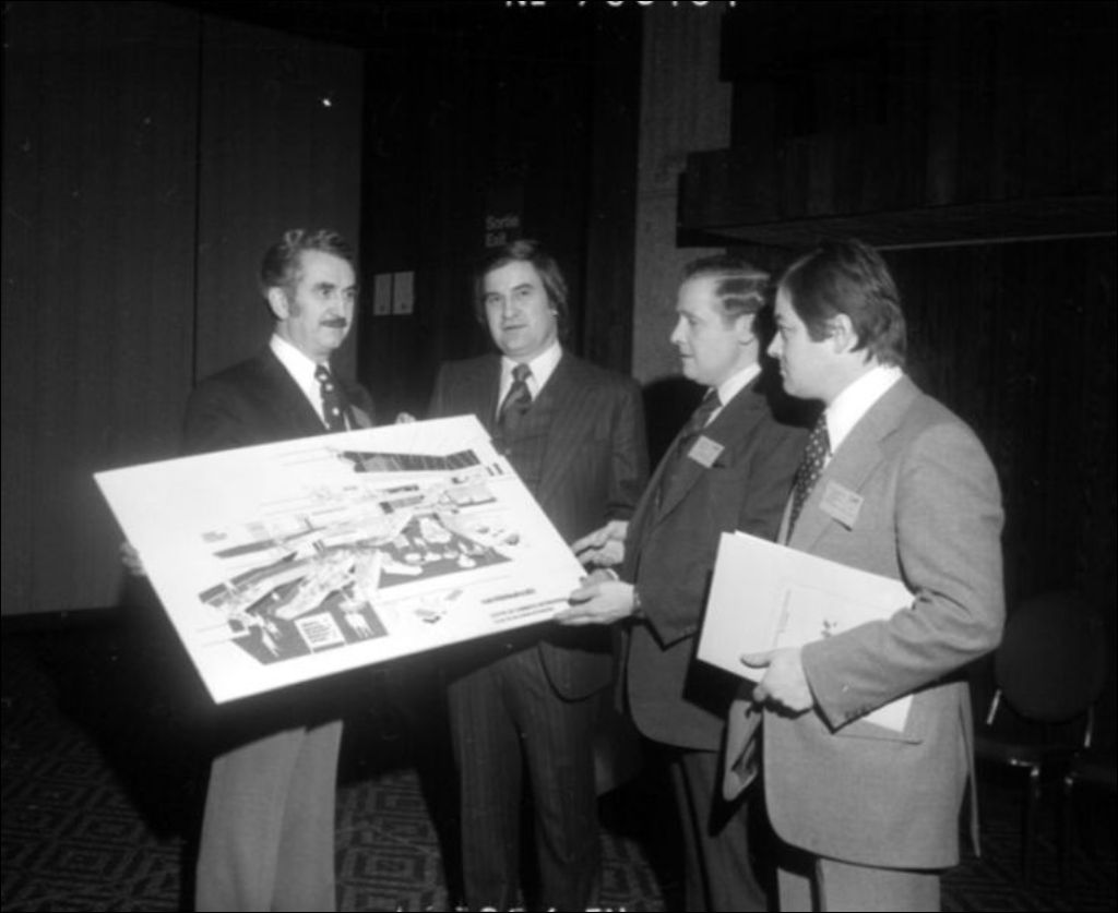 Conférence de presse du ministre Guy St-Pierre pour la construction du Centre de commerce mondial, 1975, Archives nationales à Montréal, Fonds Ministère de la Culture et des Communications, (06M,E6,S7,SS1,D750101-750114), Adrien Hubert.