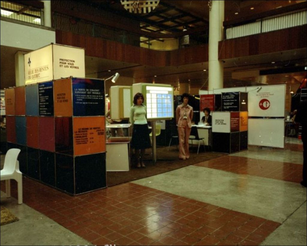 - Les photographies montrent deux sections du kiosque.; la section réservée à l'éducation aux adultes et celle de la Régie des rentes du Québec. Ces clichés ont été commandés par André Boissonneau de la Régie des rentes, Service de l'information