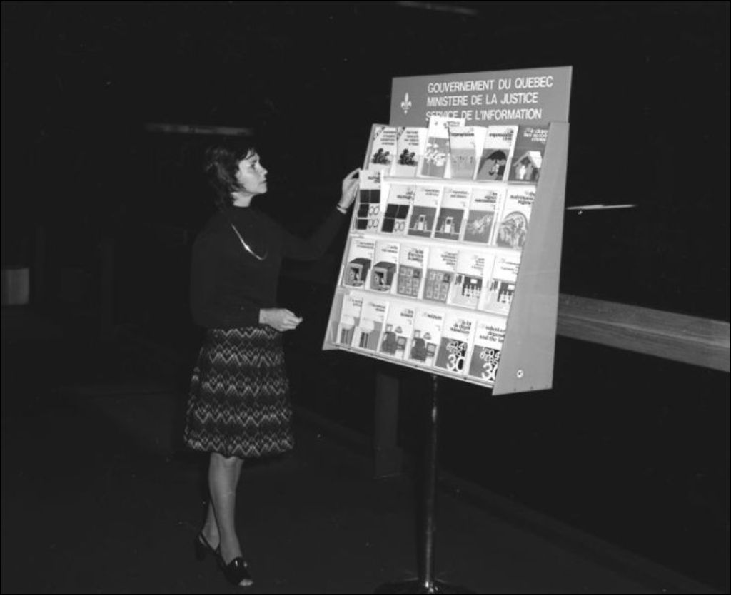- Les photographies montrent une secrétaire au téléphone. On remarque aussi un présentoir de dépliants à caractère juridique produit par le Service de l'information du ministère de la Justice. Ces clichés ont été commandés par Jacques Déom du ministère de la Justice, Service du Palais de justice