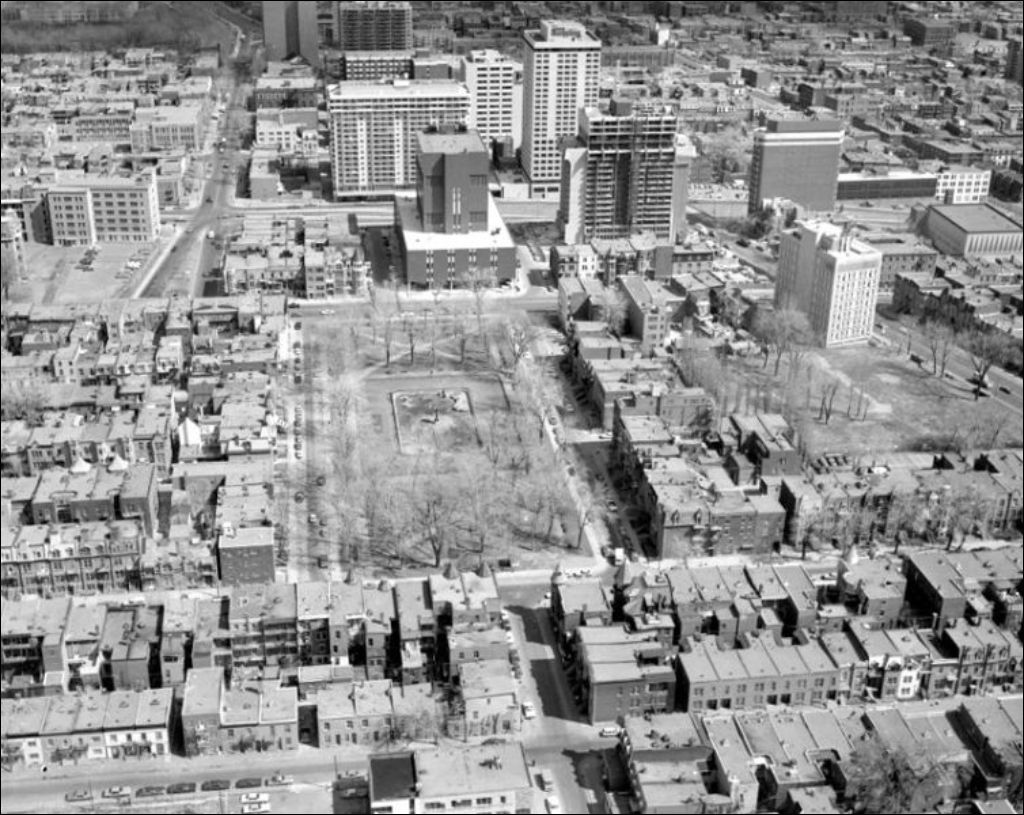 Vues aériennes du square Saint-Louis, des maisons environnantes et de l'Institut de tourisme et d'hôtelleriedu Québec à Montréal, 1976, Archives nationales à Montréal, Fonds Ministère de la Culture et des Communications, (06M,E6,S7,SS1,D760961-760976), Gilles Langevin.