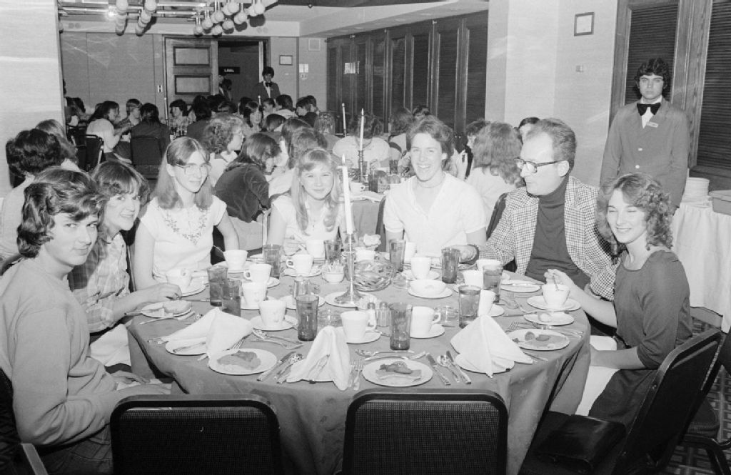 - Départ de 120 élèves ontariens. Nous remarquons deux orateurs prononçant un discours. Ces photographies ont été commandées par Jacques E. Couture du ministère de l'Éducation, Service des communications