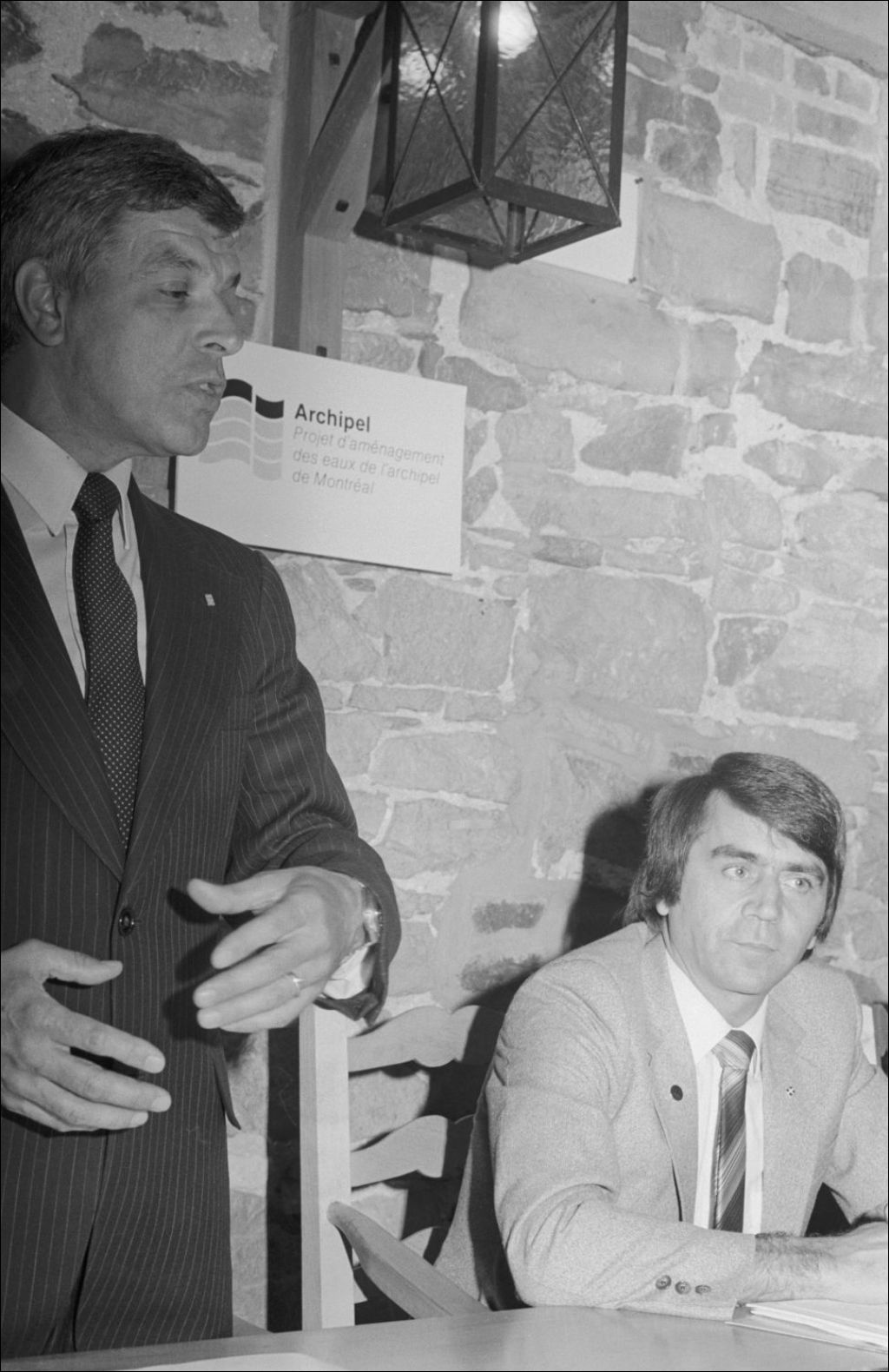 - Le projet Archipel concerne l'aménagement des eaux de l'archipel de Montréal. Nous supposons que la conférence se déroule avec le ministre de l'État à l'aménagement, François Gendron. De plus, quelques personnes examinent une maquette des rapides de Lachine. Ces photographies ont été créées pour Raymond Faucher du projet Archipel