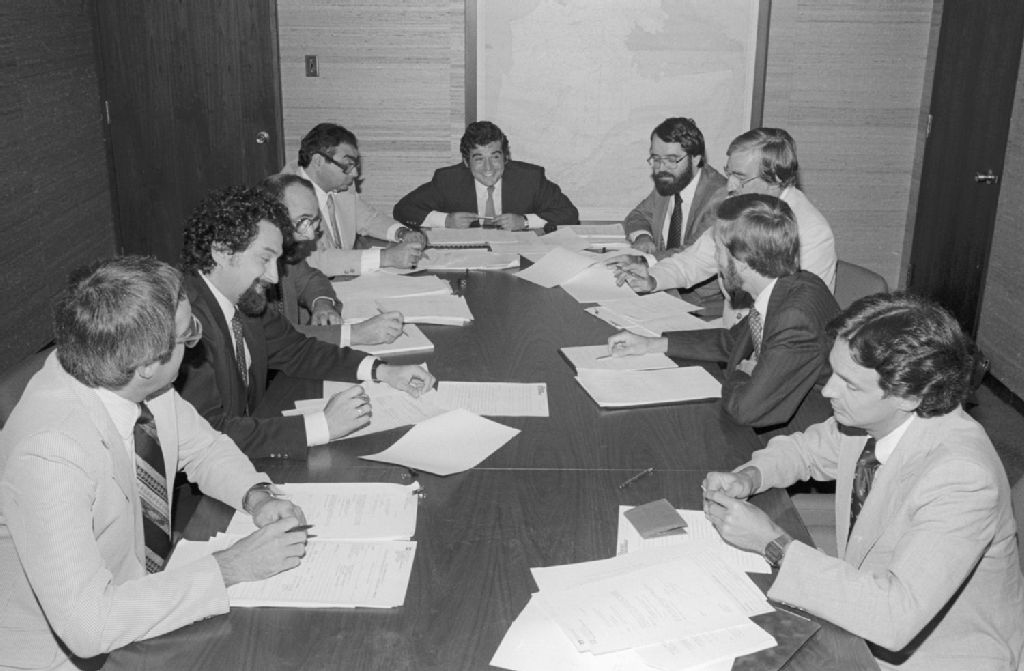Groupe en réunion au bureau de M. Bonifacio. Place Ville-Marie, 23e étage, Montréal